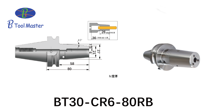 | BT30 | -CR6-80RA | 6 | 21 | 27 | 7.5 | 80 | 58 | 36 | 26 |